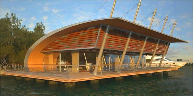 水上建筑設(shè)計(jì)適宜采用通透的建筑外殼,輕盈的建筑造型,因此該水上運(yùn)動中心建筑設(shè)計(jì)采用現(xiàn)代風(fēng)格,采用鋼架結(jié)構(gòu)的形式,建筑材料專用采用鋼構(gòu)架、防腐木和玻璃,屋頂設(shè)計(jì)采用流線型,挑出屋頂?shù)闹雍弯摻z拉線與現(xiàn)狀水上高爾夫的張拉膜結(jié)構(gòu)形成統(tǒng)一風(fēng)格。